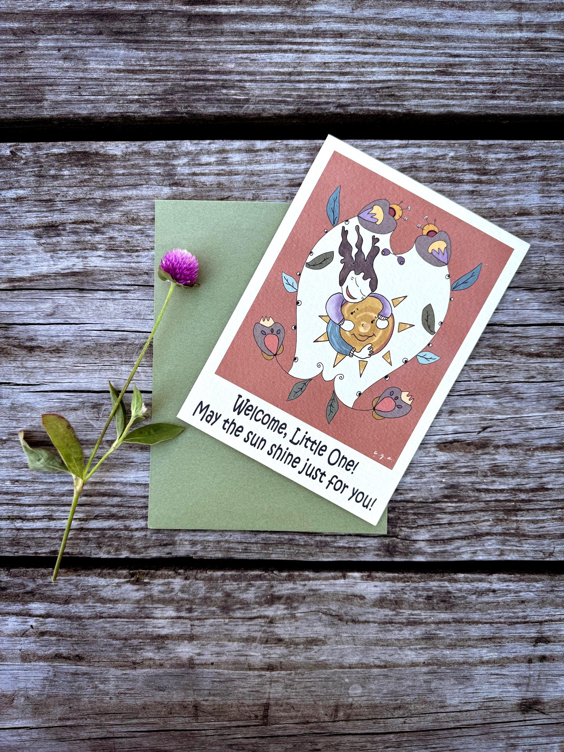 The birth of a baby is like the rising of the sun. My illustration was created with this idea in mind. I hope this warm and joyful greeting card helps you celebrate the arrival of a new baby. The design is available in two versions: baby girl or baby boy.